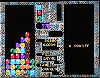 Next up is 1994's Stack Columns, a Japanese-only arcade venue where its story mode has you compete against different faces in the different continents of the world in a tournament-style competition. Its classic Columns gameplay, but with an added twist: when you start off the game you can choose whether to enable or disable it, but basically any time you do away with a line of three or more jewels you'll be given some coins which at the press of a button will not only have the opponent's platform raised little by little but counteract the current stack they're using so they have no recourse but to use a different set... the same thing could happen to you if you're not careful, so bear that in mind as you play it.