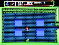 In the top-down action-adventure game Neutopia you take control of the young warrior Jazeta, descendant of Murdock, whom you can move around in a square-pattern comprising of four directions whose sword is his primary weapon which you can use with the I button, the II button is reserved for the secondary item which you can select and highlight in the inventory menu whenever you access it with the Run button, and while in the menu screen should you be inside any one of the eight labyrinths you'll see a map keeping track of your current position. Throughout the course of the game you'll come across items that will bebeneficial to Jazeta's aid--sometimes randomly dropped by monsters you take down or found inside random chests (which you open by walking towards it from any angle) or bought inside a shop (provided you've got enough gold to spare)--like silver coins (worth 10 gold), golden coins (which are worth 50 gold), a bomb (for which you'll regain four each time), a cherry that replenishes your lost health by one whole block, magic rings that when used will render all present onscreen monsters into weaker ones (which are one-time use only), a pair of wings that will return you to the last place you were given a password (which again are one-time use), potions that completely refill all your lost health reserved for when you need it